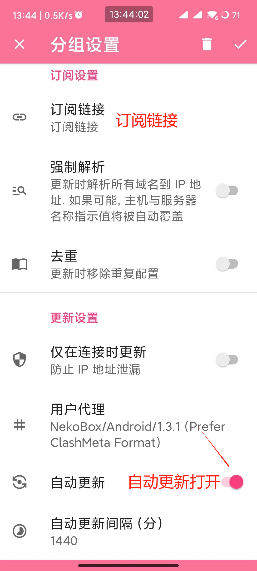 6.输入订阅链接,打开自动更新 订阅链接看图1"复制订阅地址"